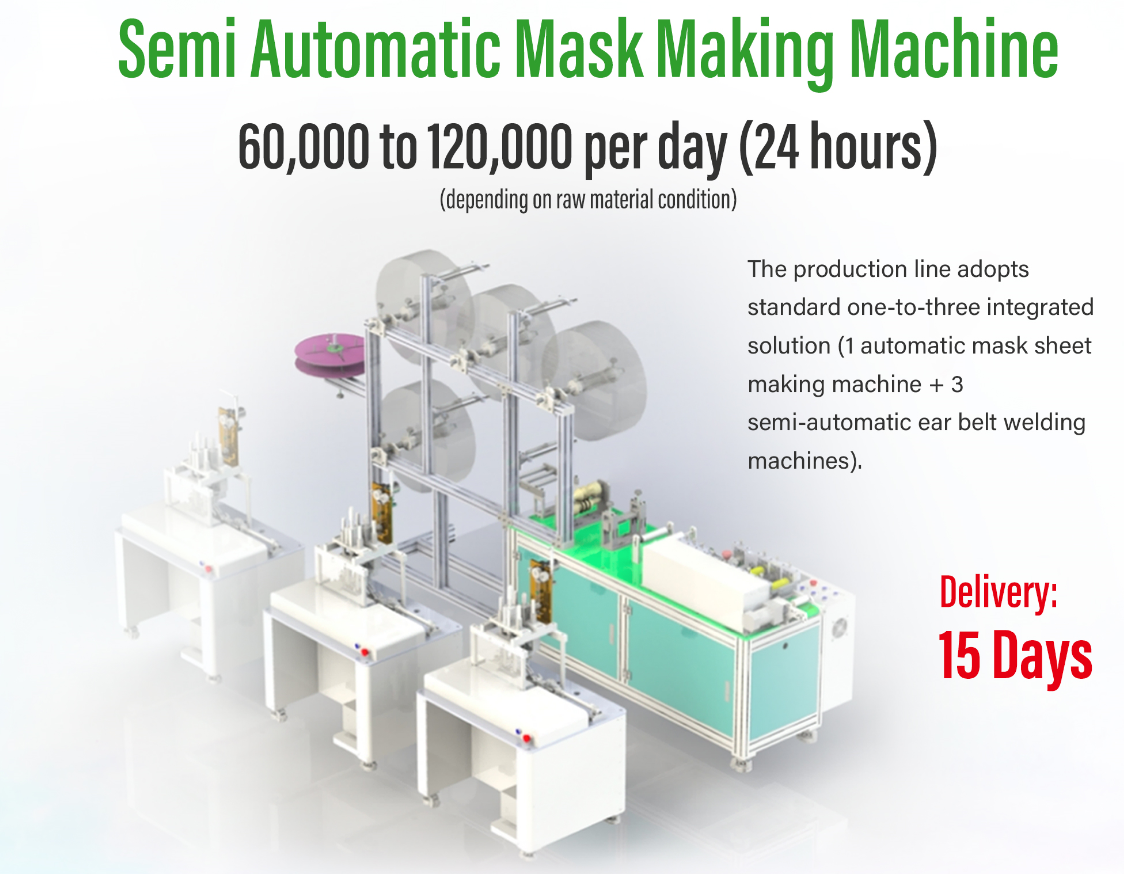 平面口罩机参数: Semi-Automatic Mask Machine l Power supply: 3.3KW mono phase l Mask Size: 175mm*80-100mm (two or three layers) l Nonwoven (GMS): 10-50g l Capacity: 120 to 150pcs/min l Dimension(L*W*H):3800mm*500mm*1400mm l Net Weight: about 1000kg 焊接机参数: Welding Machine l Capacity: 5 to 10pcs/min l Power supply: 8.5KW mono phase l Compressed Air connection: 0.5 to 0.7Mpa l Dimension(L*W*H): 900mm*650mm*1380mm l Net weight: approx. 50kg KN95口罩机参数: N95 Mask Machine l Capacity: […]